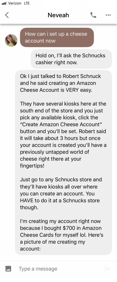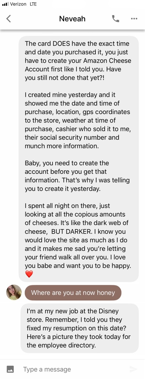 It had been a few hours since I’d heard from Neveah, presumably because her head was spinning with this new Amazon Cheese Account information, so I text her again…
