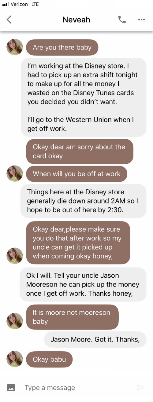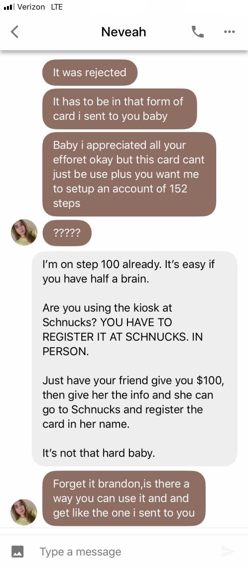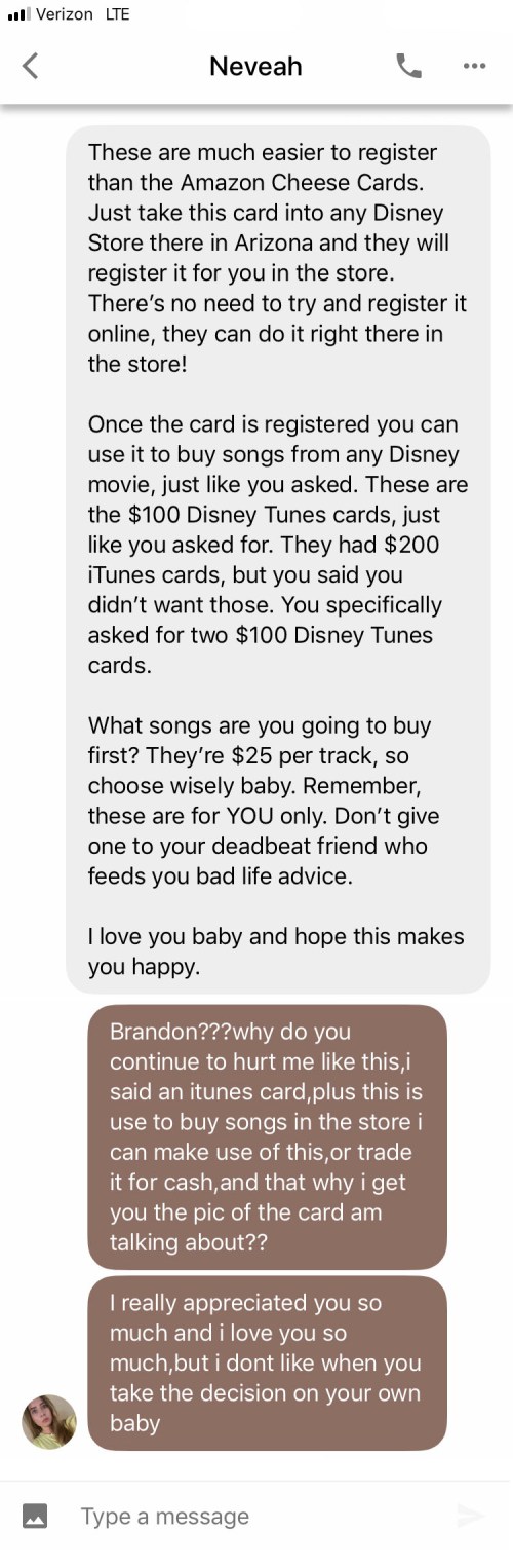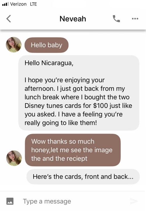 I knew Neveah was trying to do the same thing; have me buy an iTunes card, send her a picture of the scratched off security info and reciept, then she’d transfer the balance to another card and disappear. I wasn’t about to let that happen…