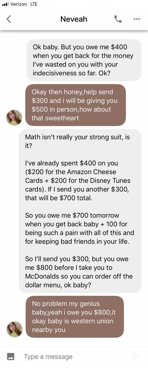Neveah started laying the love talk on extra thick once I offered to get her a $200 Amazon gift card instead of one for $100. She’d taken the bait and was all-in on scamming me now…