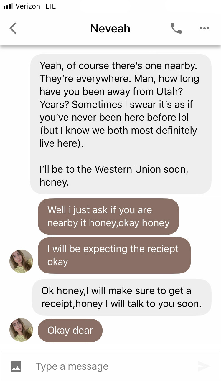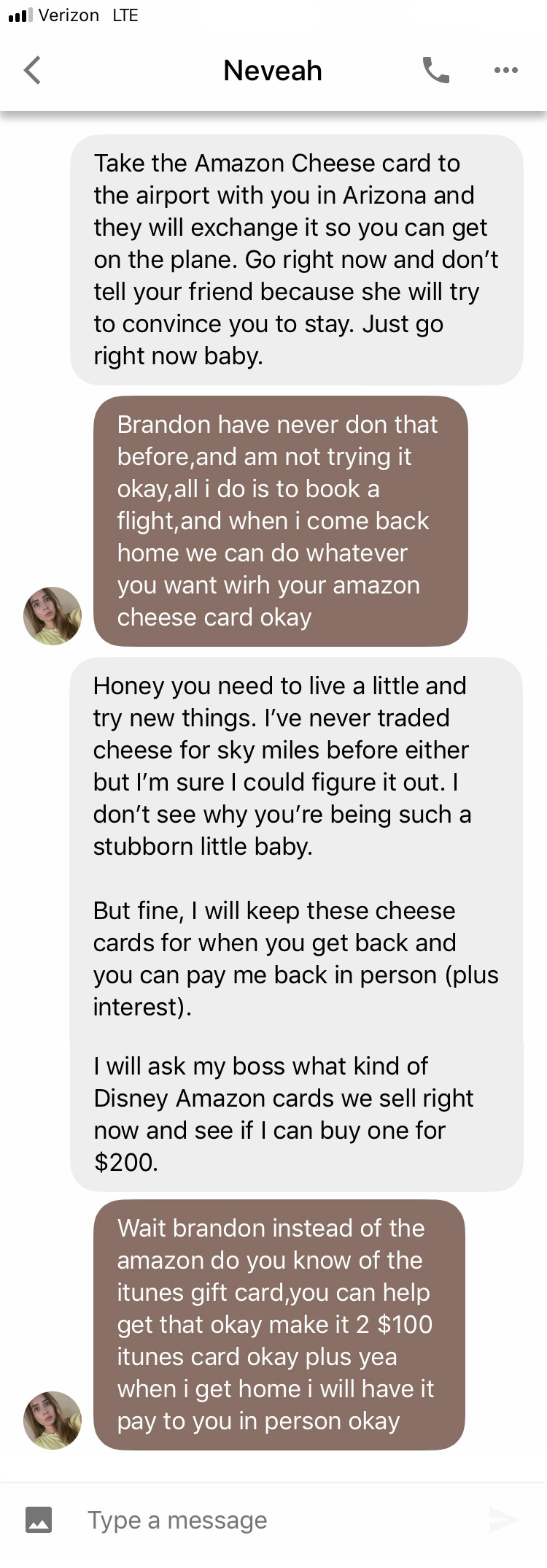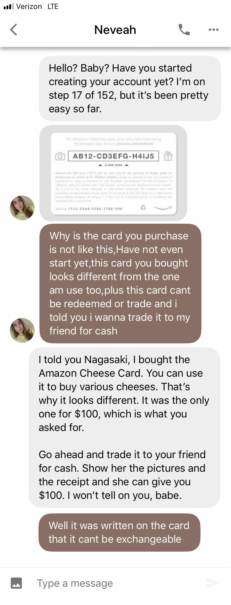 Neveah started laying the love talk on extra thick once I offered to get her a $200 Amazon gift card instead of one for $100. She’d taken the bait and was all-in on scamming me now…