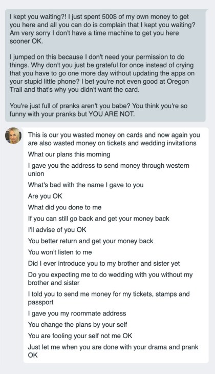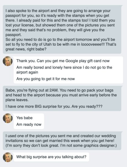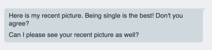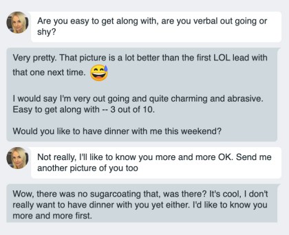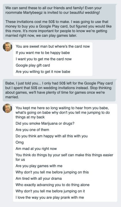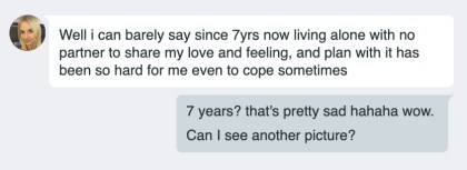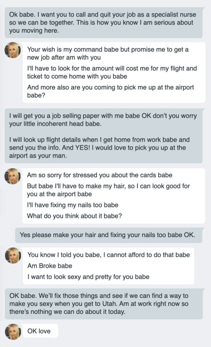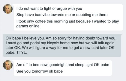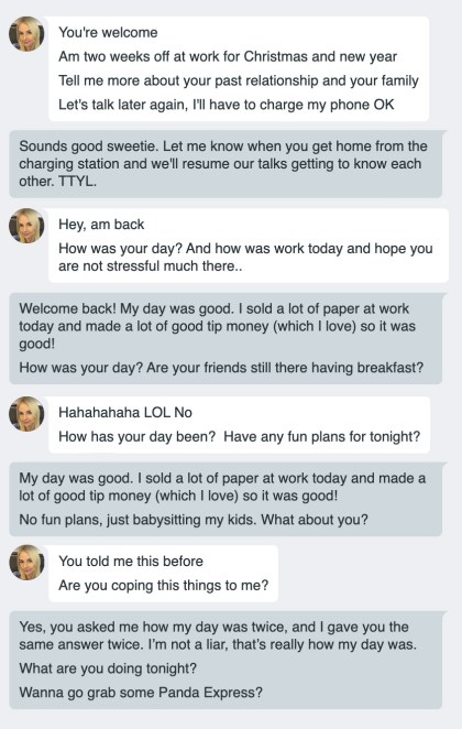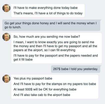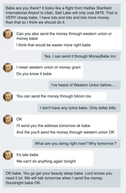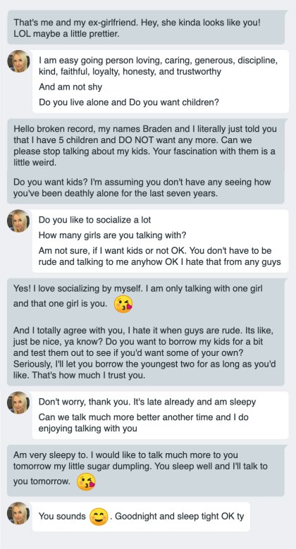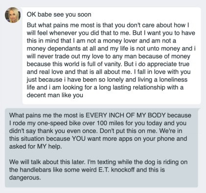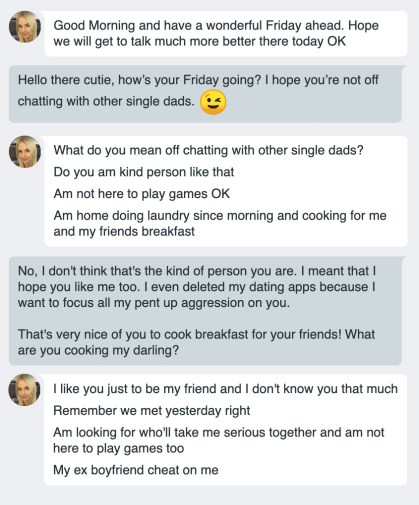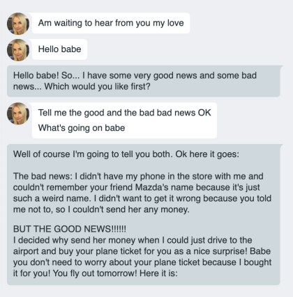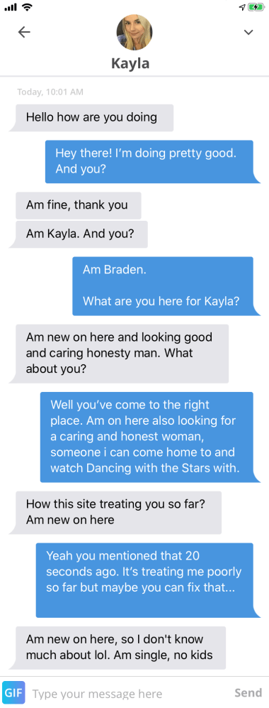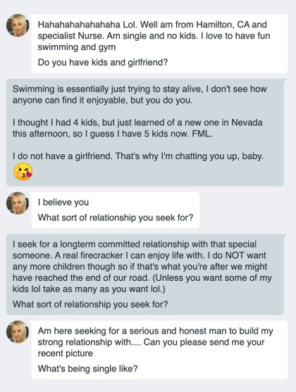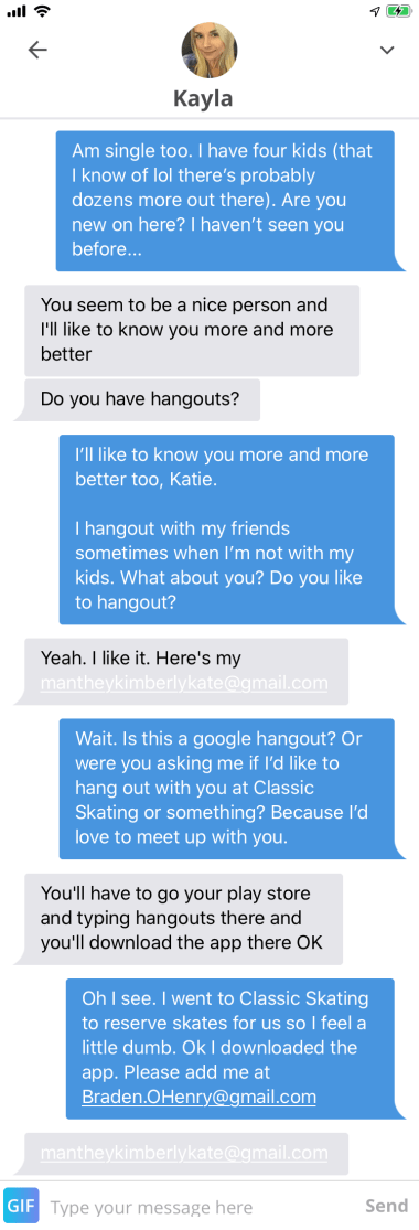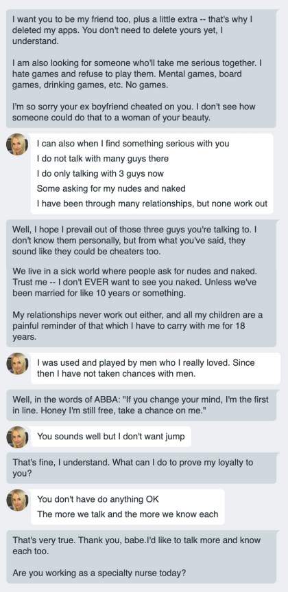 The scam Kayla was running is based on the premise that we’d fall madly in love so I’ll send her money, and yet here she was putting me in the friend zone. Props to her for not rushing into our pretend relationship…
