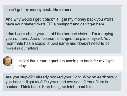 I still don’t know what Kayla was getting at saying she was going to book her own flight. Maybe it was an last-ditch attempt to try and get me to cancel the flight I’d booked on a fake airline and wire her the money instead?