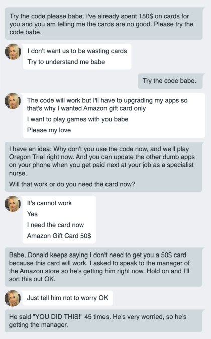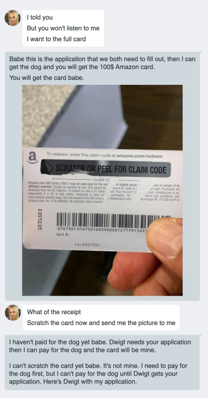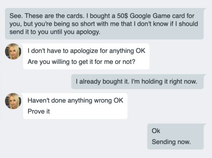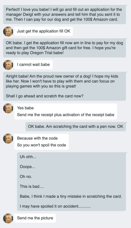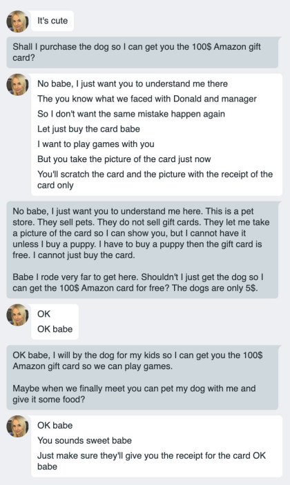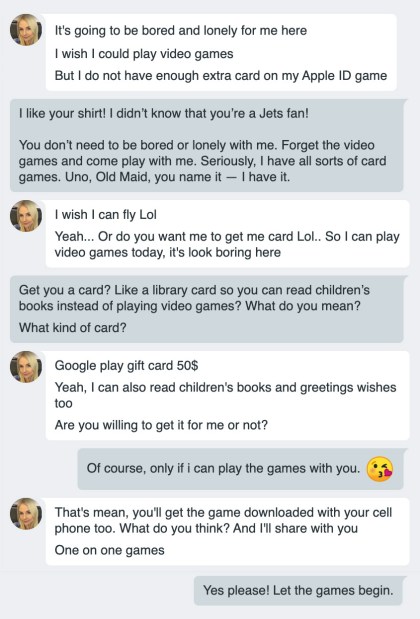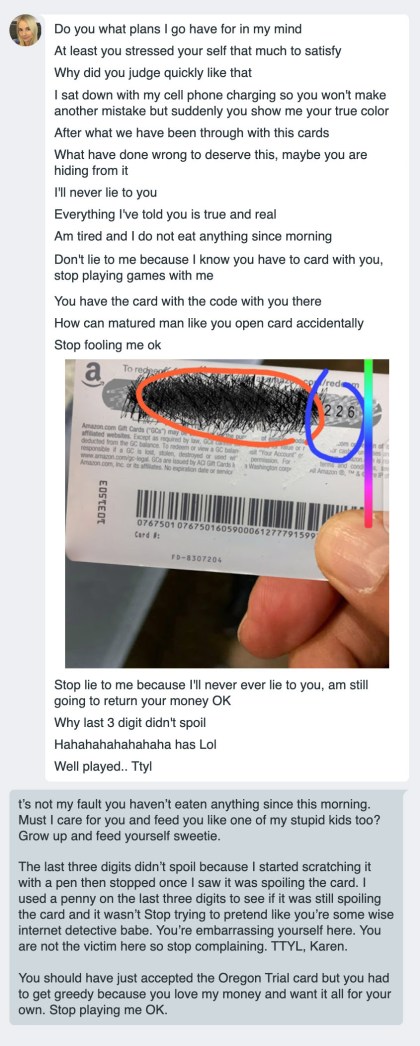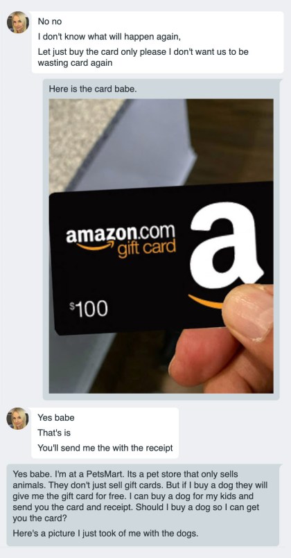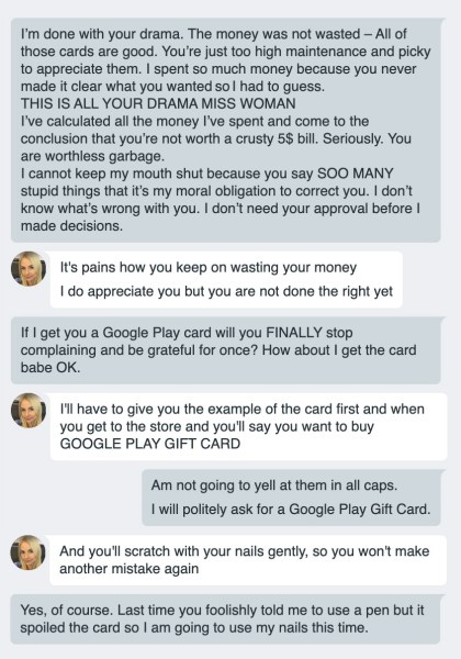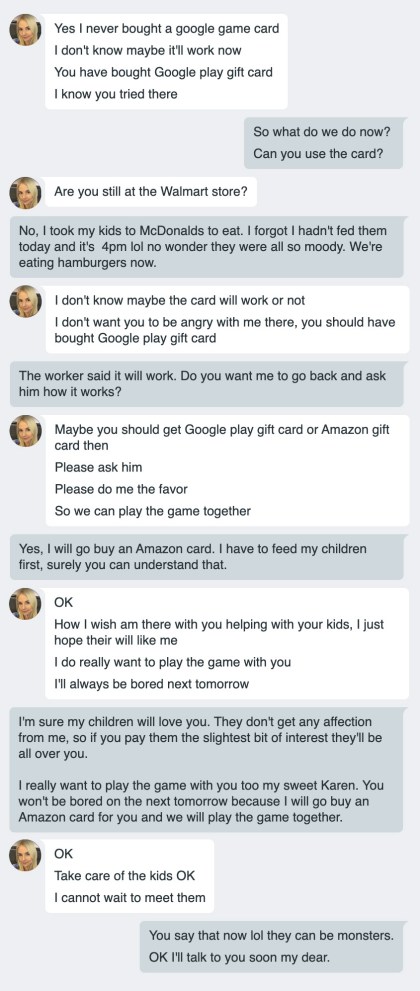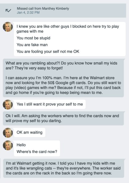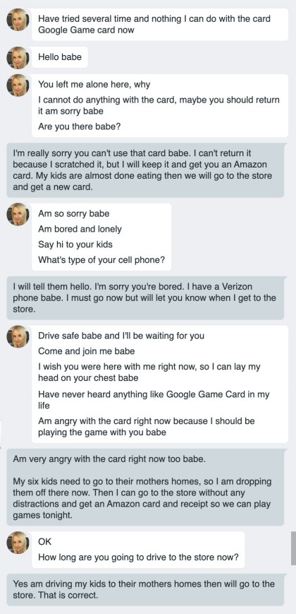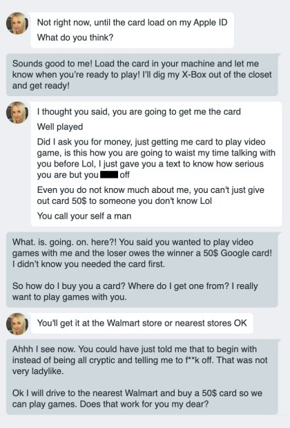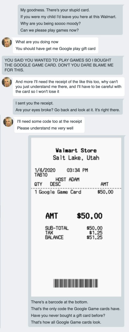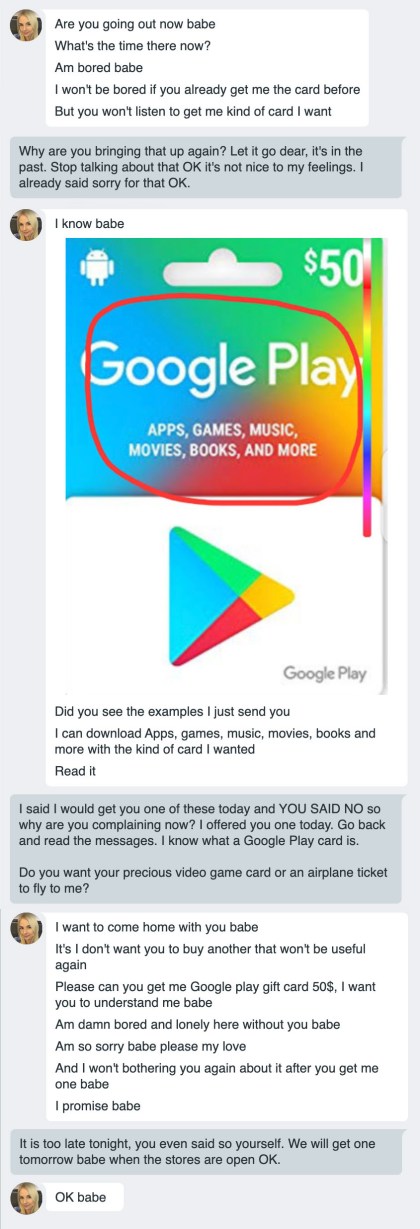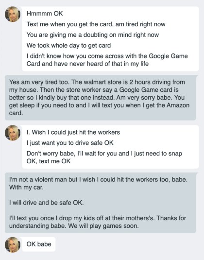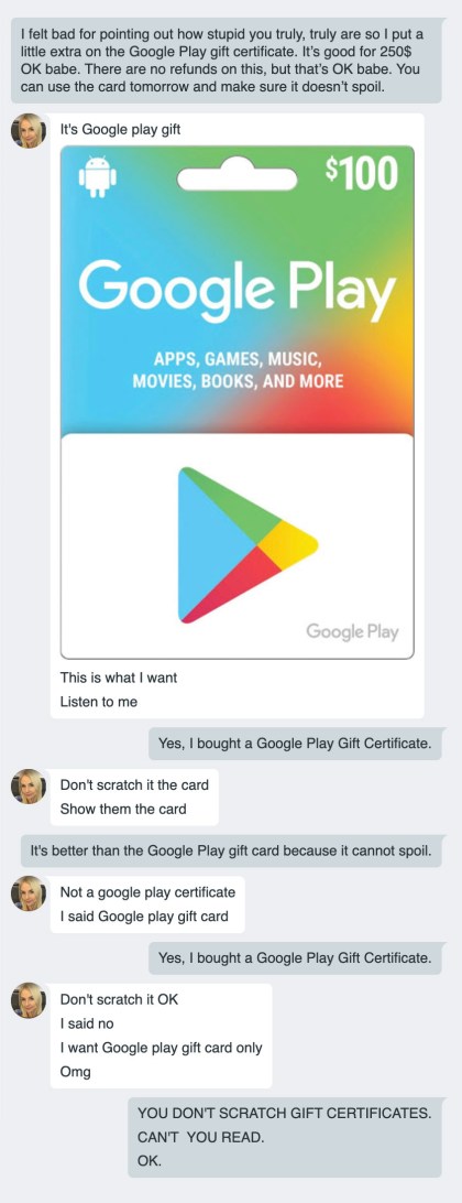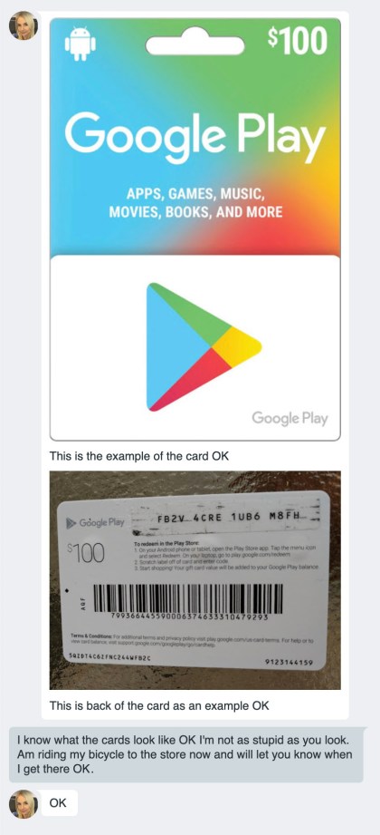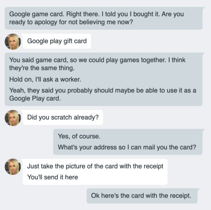 FINALLY — We’d arrived at the scam. Kayla wanted me to send her a Google Play gift card so she could transfer the balance to another card and disappear forever.