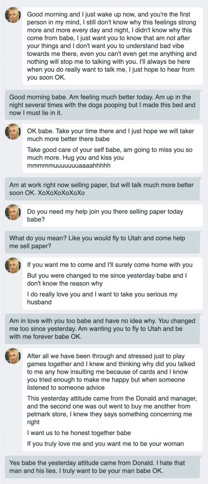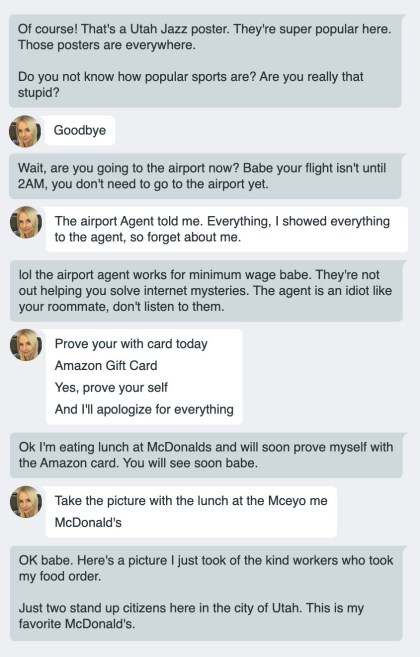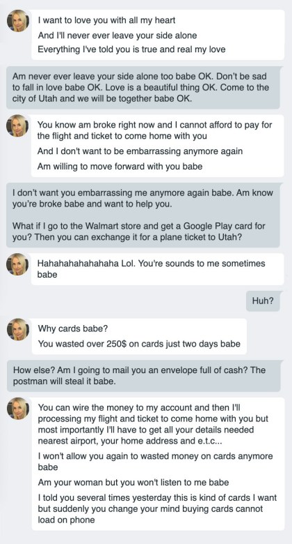 I’d failed several times at sending Kayla gift cards but she truly believed she was sitting on a goldmine with me and decided to go ALL IN on the scam. No more 50$ gift cards — she was playing in the big leagues now, hoping I’d wire her hundreds of dollars so she could fly to the city of Utah to live with me…