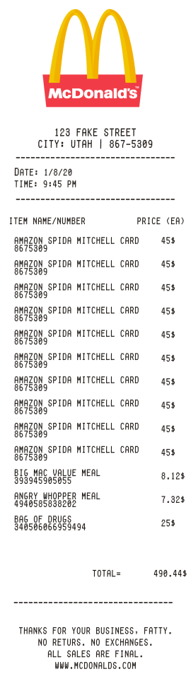 I listed the address for the Salt Lake City Police Department on the Amazon receipt and a phone number for the all-time Tommy Tutone classic 867-5309, which has been featured in several of my scams and would make several more appearances in this one. Just try and listen to this song without singing the backup vocals “EIGHT-SIX-SEVEN-FIVE-THREE-OHHH-NI-EEEE-INNNE!” you can’t do it!