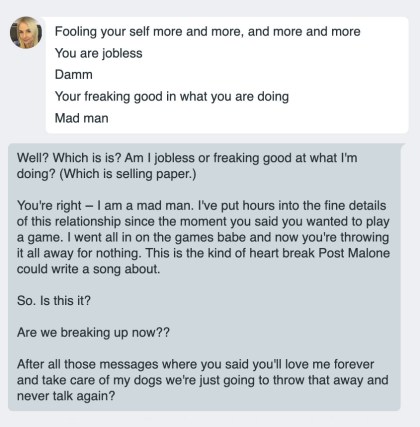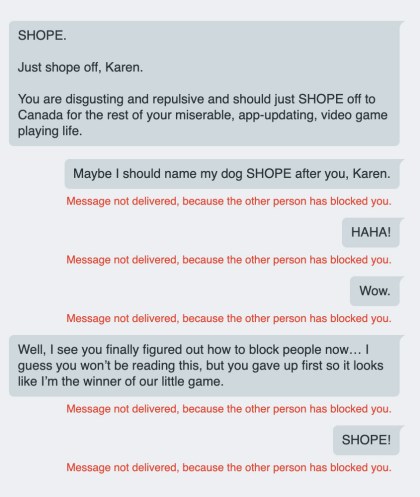“You are the dumbest person I’ve ever met in my entire life.” was the most coherent sentence Kayla had pieced together since we started talking and it was a copy + paste job sent immediately after I sent it to her.