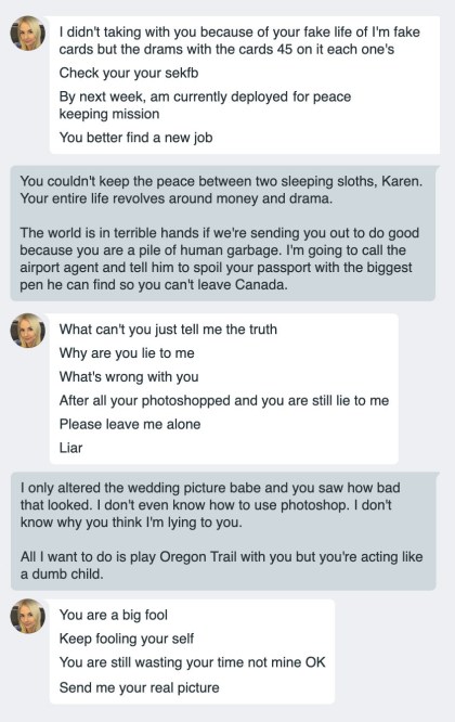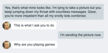 Kayla was adamant that I confess I was a fake and reveal my true identity, but that wasn’t going to happen because I have two personal rules that I follow with these scams: