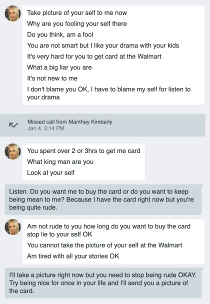 Kayla’s demeanor went from cold & short to overly friendly & understanding once she saw the photoshopped card and realized that I wasn’t playing games with her (I really was) and that I was going to send her money (I really wasn’t).
