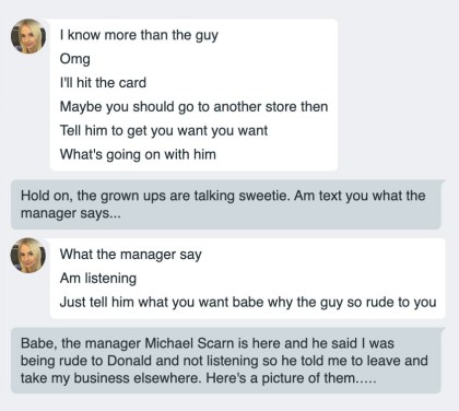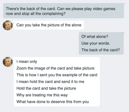 I waited for the keyboard warrior to finish her frantic messaging and sent a picture of the back of the card…