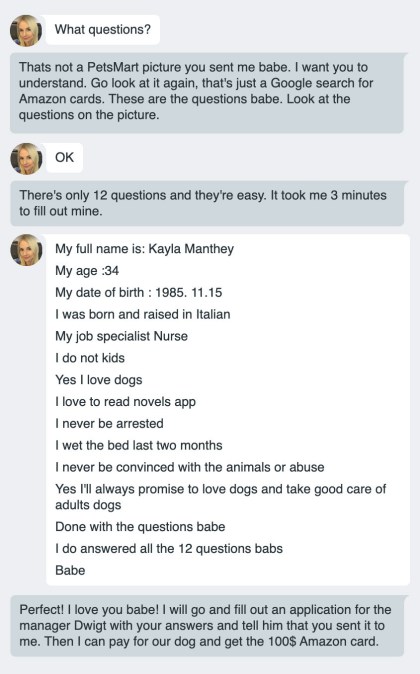There are a lot of complex scams happening these days (ones that put Kayla’s to shame) so PLEASE be smart with the personal information you put out there and the strangers you talk to online. Think twice anytime your money is involved, and if you find that you are dealing with a scammer — please send them my way so I can introduce them to Braden and his adopted dogs.