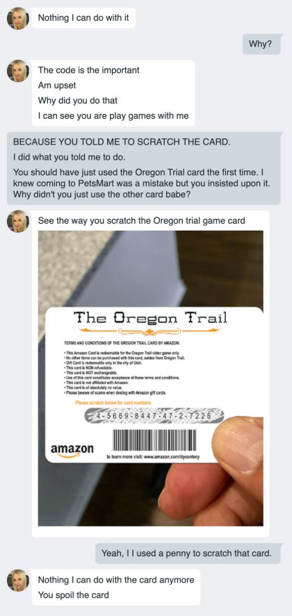 I sent Kayla a picture of the scratched card, which just so happened to be the exact same picture she sent me of the card a few minutes earlier, with the Oregon Trail Card photoshopped over the top, but I was confident she wouldn’t recognize her own hand…