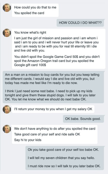 Speaking of red flags, now is the time that I share the same thought that I share at the conclusion of all my scam stories: If you find something (or someone) on the internet that seems too good to be true, it probably is and there’s a good chance you’re dealing with a scammer. If a complete stranger asks you to send them money or gift cards, they’re probably a scammer. If your bank, government, hospital, local law enforcement, etc. call out of the blue asking you to verify personal financial information, they’re probably a scammer.