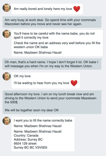 The sad part of these scams is the how many people they effect. There was a good chance that Mazbeen was unknowingly involved in some other scam Kayla was running, with Kayla on the other end telling her “my uncle Braden is going to wire you $500 and I need you to send it to me at xxx because I lost my license.” Shuffling money around like this is a common tactic used by scammers because it makes it difficult to track the money and scam source should authorities get involved.